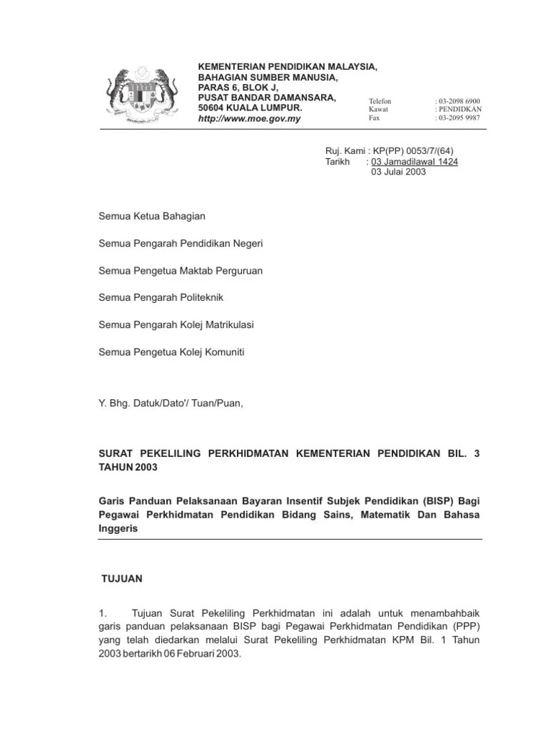 Click here to load reader. Pekeliling berkaitan turut dimuatkan dalam buku ini. Pekeliling / surat pekeliling / surat edaran. Contoh surat pengesahan itu adalah seperti di lampiran `a'. Contoh format kepala surat kementerian/jabatan/agensi persekutuan adalah seperti berikut. Surat pekeliling am ini berkuat kuasa . Cara penulisan bibliografi apa style. Click here to load reader. 6 tarikh kuat kuasa 12. Surat pekeliling bisp · documents · surat pekeliling pemulihan. Contoh templat kepala surat rasmi (termasuk perhubungan · documents · kerajaan malaysia surat pekeliling perkhidmatan.